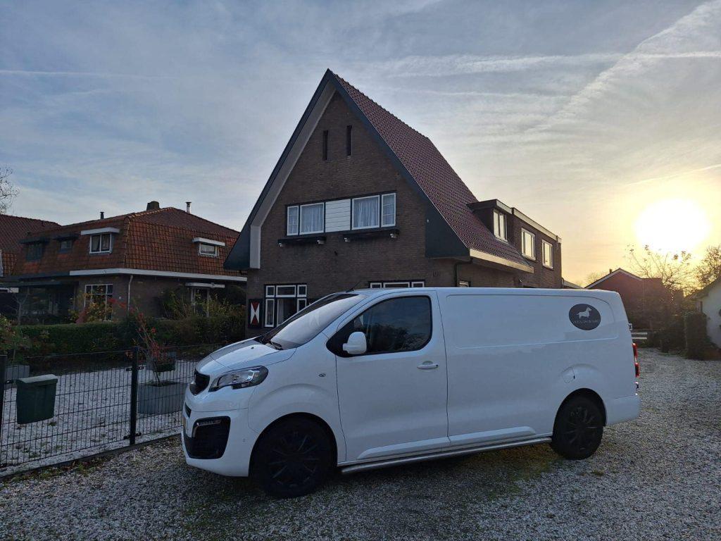 Ik haal de hond thuis op met mijn witte bus. In de bus zijn hokken ingebouwd voor de honden. De bus is voorzien van goede ventilatie. Ook is er een brandblusser en EHBO set aan boord. En vooral veel koekjes en water. Zorg ook dat de halsband of tuig klaarligt, hier hang ik mijn telefoonnummer aan.